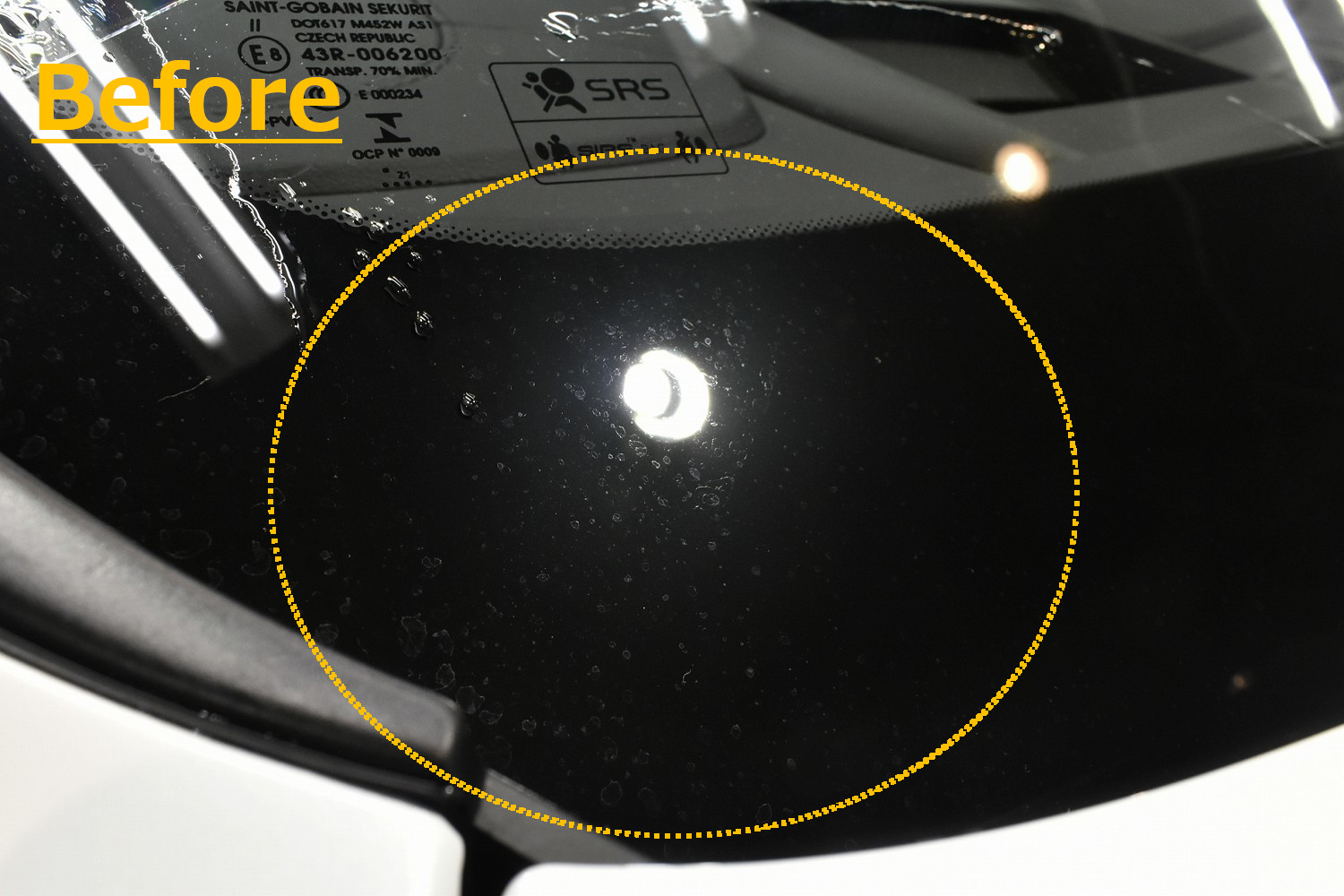 車の顔と言える箇所ですが、良く見ると雨染みが付着し簡単に取れないケースがあります。このような場所はケミカル剤や研磨により雨染みを除去します。