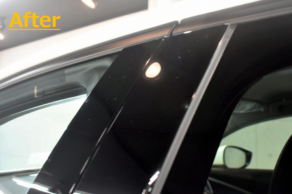 比較的、高級車のピラーはピアノブラック樹脂が採用されるようになりました。この箇所にキズがあるかどうかで経年感がはっきり変わりますので、コーティング前には除去したいキズです。