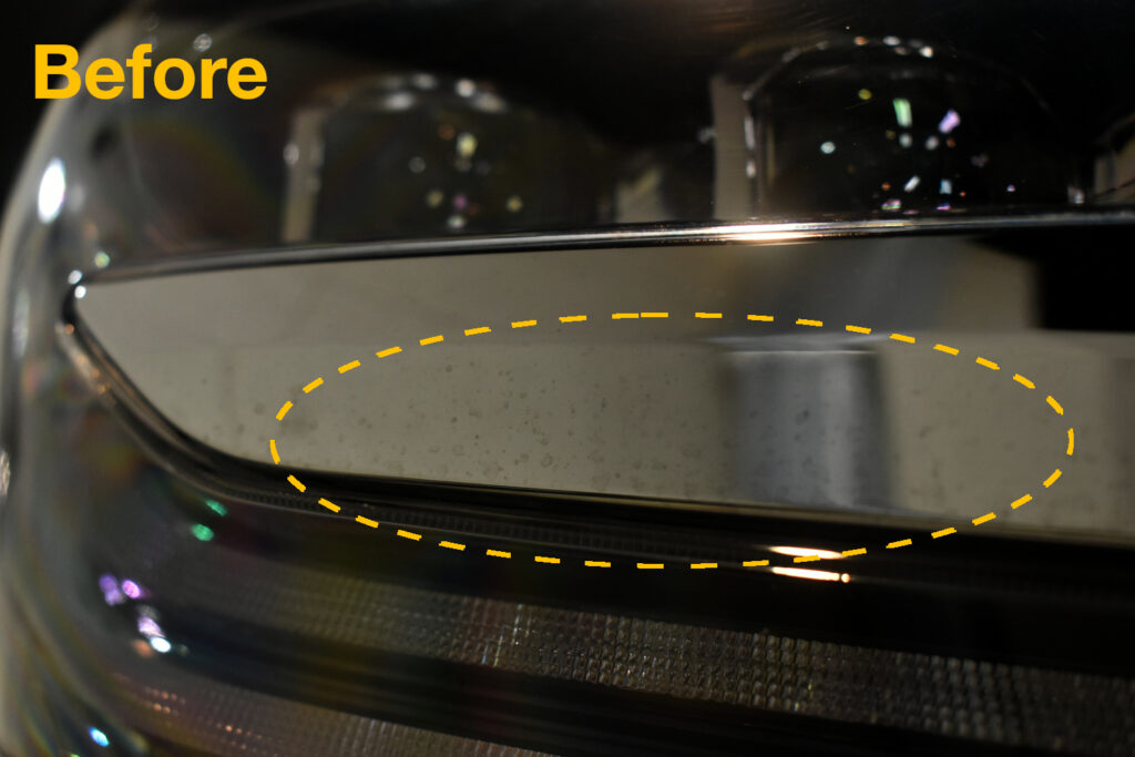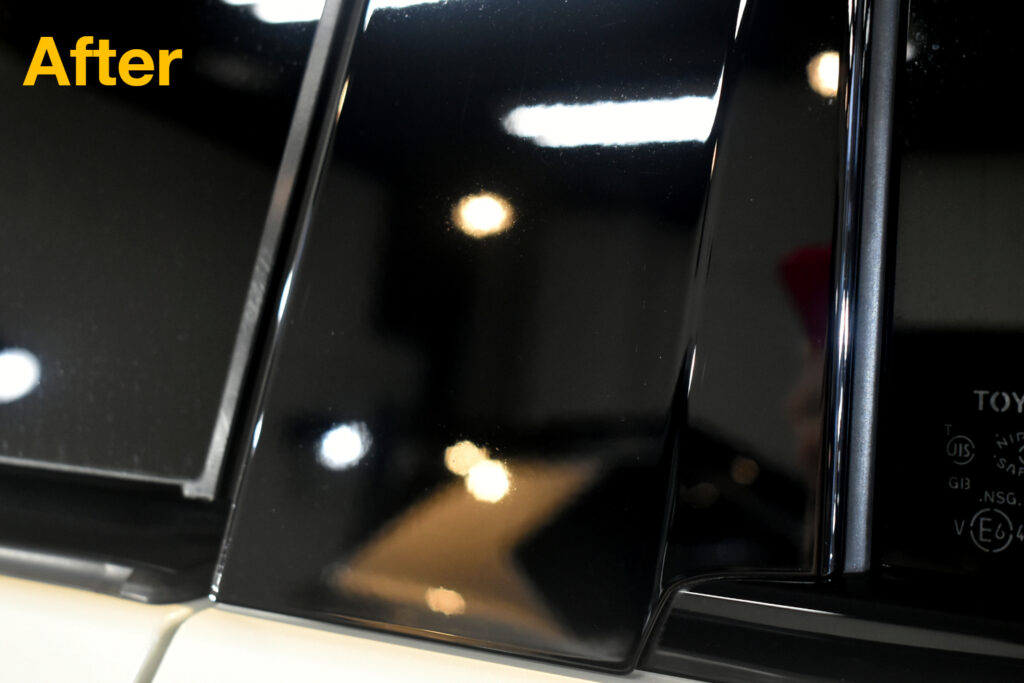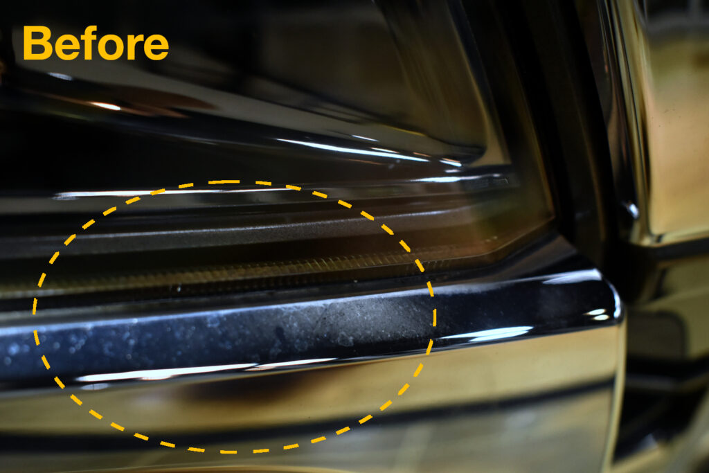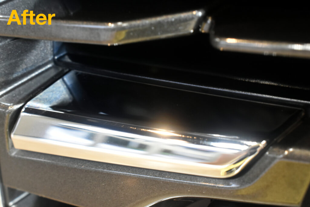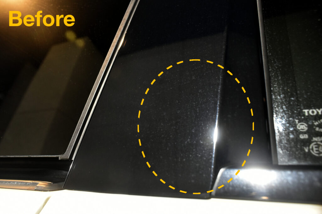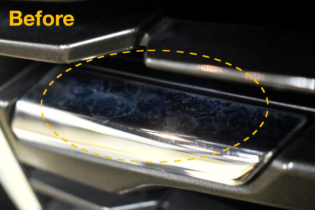 ピアノブラック樹脂も水染みが付着します。キズも目立つのでポリッシャーでできる限り除去します。