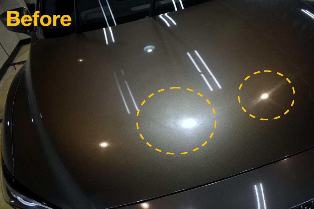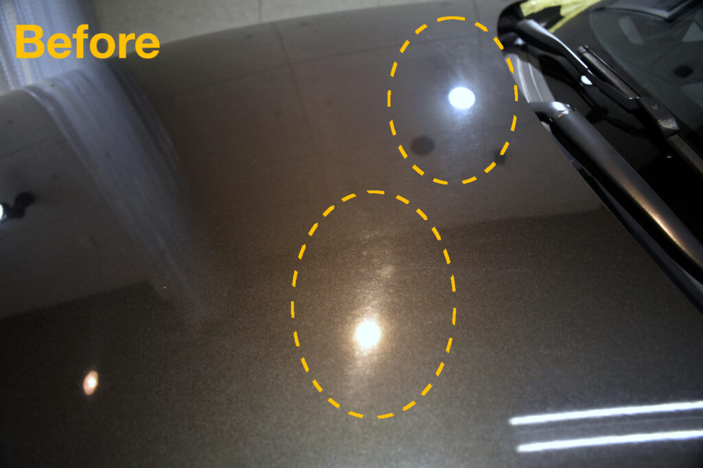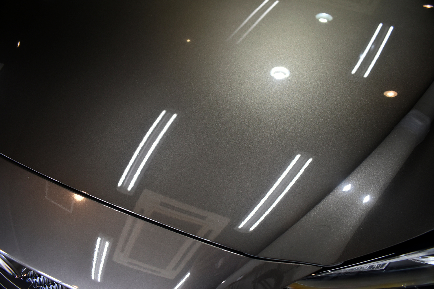 5年を超える経年は、お車をきれいに乗っていても水染みやキズが付着してます。ポリッシャーでしっかり研磨し下地を作ります。