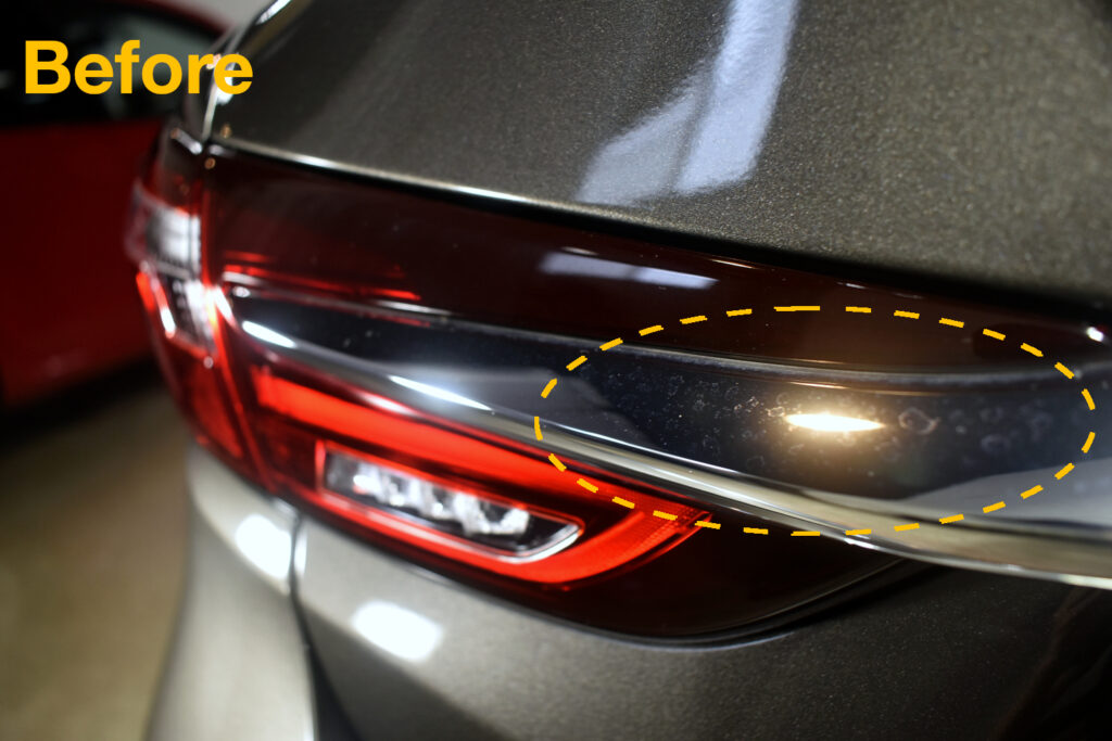 テールランプ付近には目立つ水染みがありました。クロムメッキは膜厚が薄いので慎重に研磨を行って除去します。