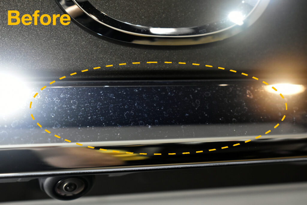 今回、ご用命いただいたリボルトグループで10年以上の実績のある「リボルト・プロ」は、艶、輝きをさらに一段増す効果があります。従来の分子量が大きなタイプではなく分子量を小さくした低分子・完全硬化型ガラスコーティングになります。無機のガラス被膜が無機の汚れを引き寄せやすいというのは、分子量が大きなタイプに見られる特有の性質のようです。分子量が小さい場合でもそれ自体は無機ではありますが、分子量が大きなものに比較すると無機の汚れは引き寄せにくいという性質を持っています。分子量の違いがガラス被膜の性質の違いに現れています。