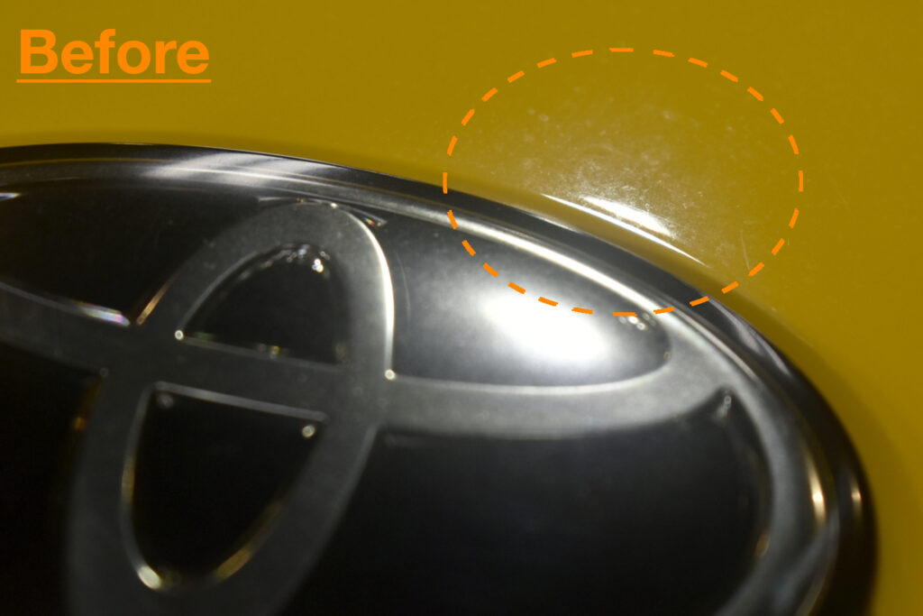 【ボンネット】ボディのカラーが黄色で見えづらい雨染みやキズもLEDライトで確認し消していきます。