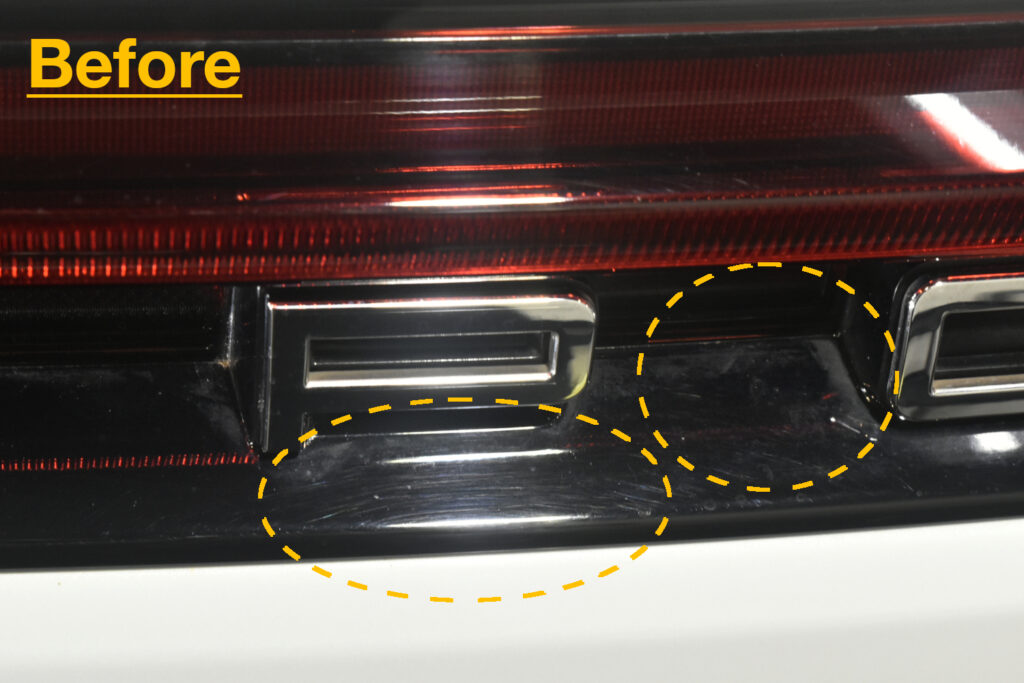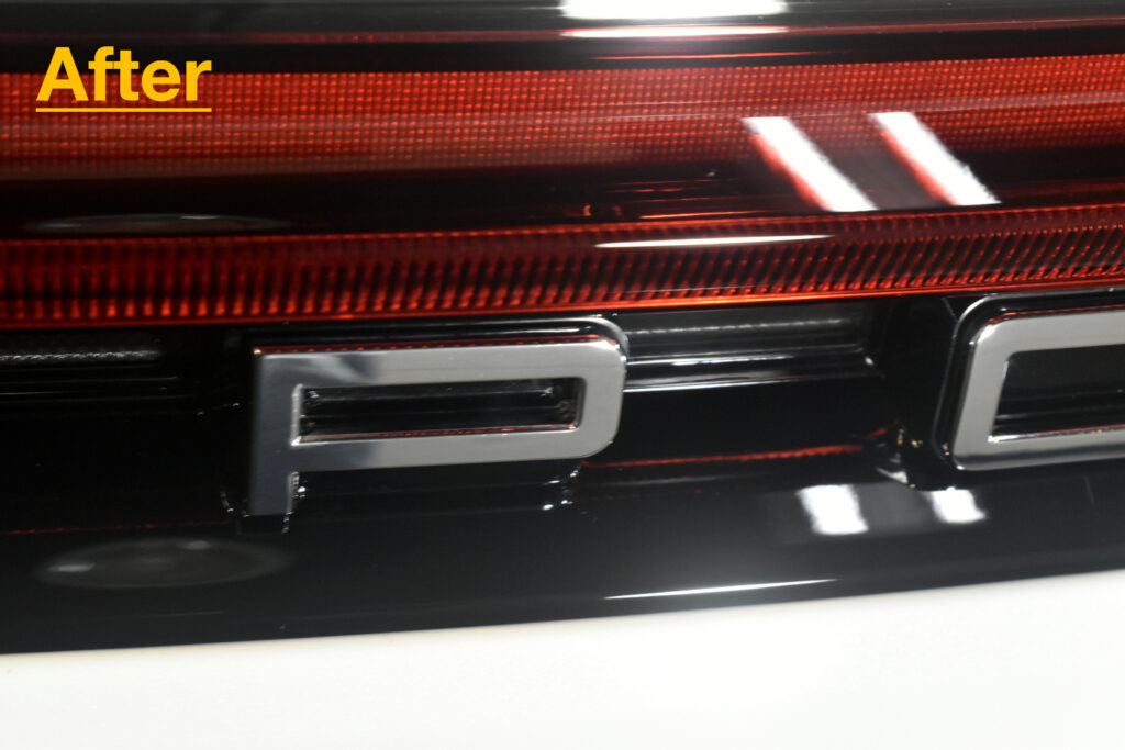 エンブレムにあるピアノブラックに多くのシミとキズがありました。ケミカル剤と入念に使用し、手磨きでキレイにしました。