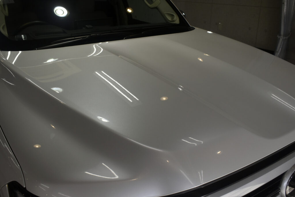 リボルトでは、コーティングの前に、高度な下地処理(Revolt Adjust System)を行います。コーティング車ですので経年よりも良い状態でしたが改めて、水染み、汚れ、キズをできる限り除去を行い見た目はもちろんのことですが、セラミックコーティング剤の定着を良くします。