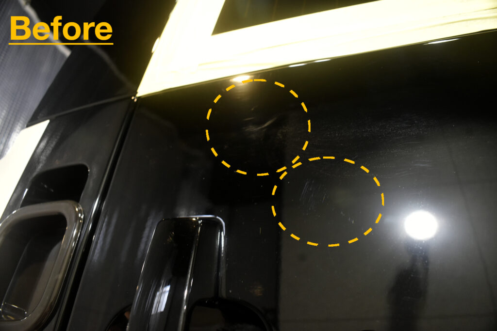 よくある洗車キズが全体的に目立っていました。