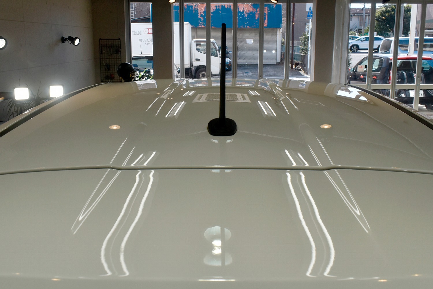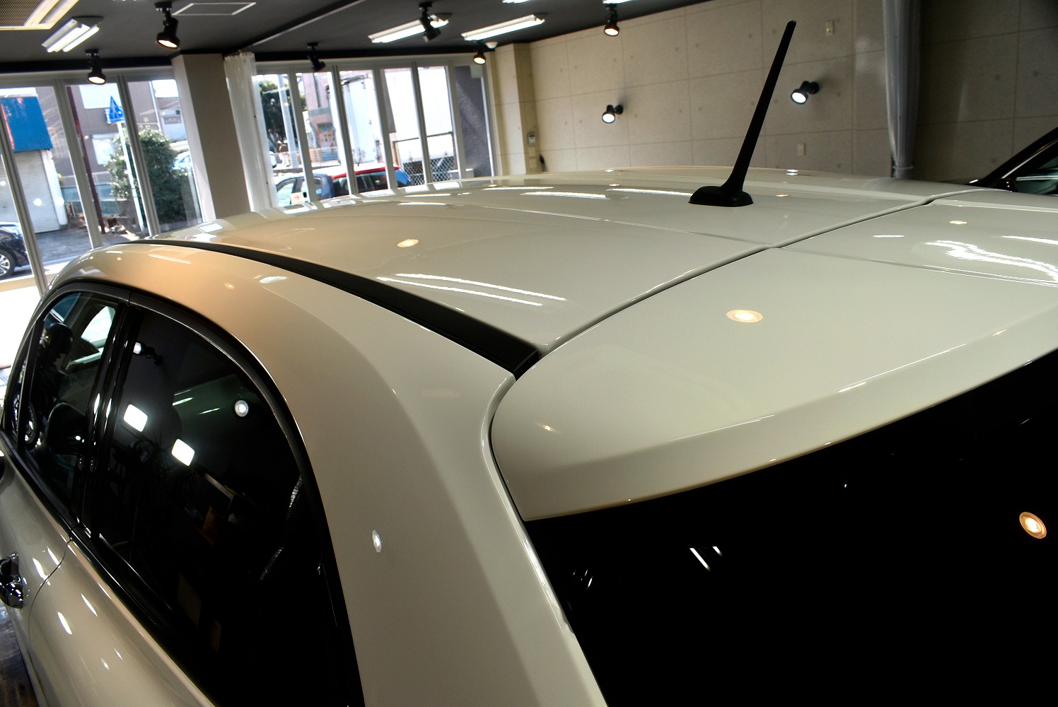 今回のお車は、オーナー様は大切にお乗りである上ボディカラーがホワイトなので、目立ったキズはなかったのですが経年なりの水染みが多く見受けられました。下地処理をしっかり行い、できる限り除去を行いました。リボルトでは経年車はもちろん新車であっても、ガラスコーティングの前に、高度な下地処理(Revolt Adjust System)を行います。見た目はもちろんのことですが、ガラスコーティング剤の定着を良くします。