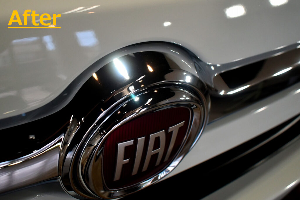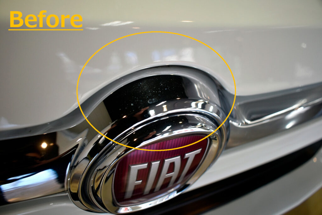 フロントエンブレムのクロムメッキはシミが目立ちます。膜厚が薄いので慎重に磨いて除去を行います。